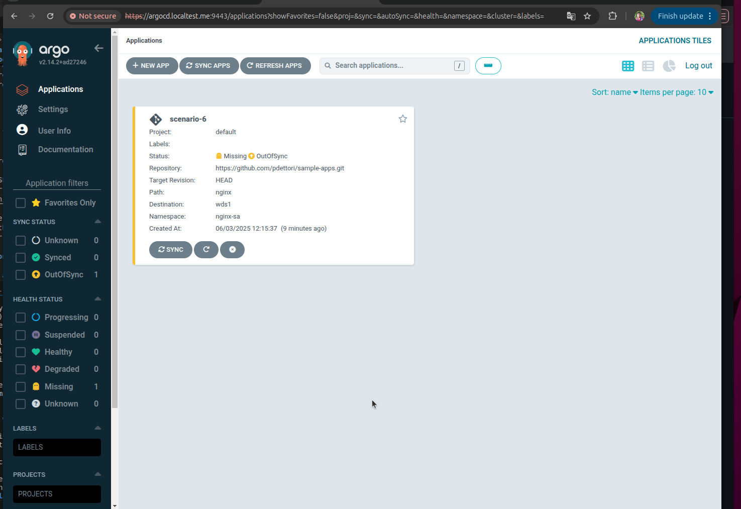 argocd:applications:# list of Argo CD applications to be create-name:scenario-6# required, must be uniqueproject:default# default: defaultrepoURL:https://github.com/kubestellar/kubestellar.gittargetRevision:HEAD# default: HEADpath:hack/argo/nginxdestinationWDS:wds1destinationNamespace:nginx-sa# default: defaultsyncPolicy:auto# default: manual